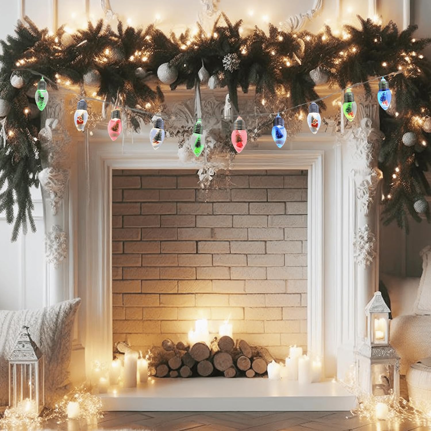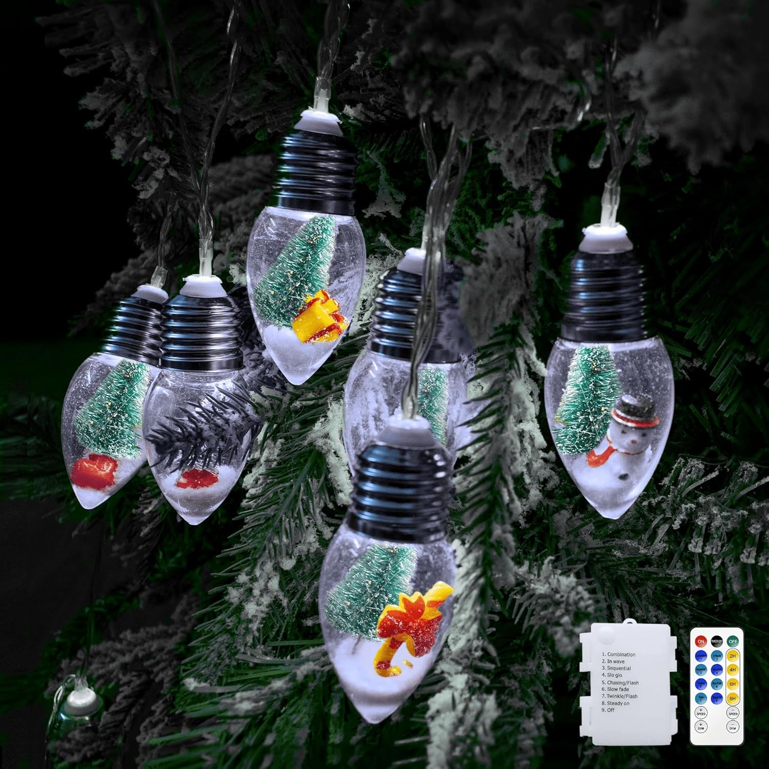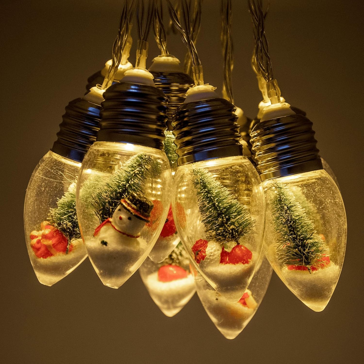 🎄Whimsical Christmas Decoration- The bulb string lights features candle-shape bulbs being filled with snow, a mini Christmas tree and cute Christmas ornaments. Illuminated with warm white LED lights from within, it creats a magical little snowy scene and Christmas festival atmosphere.
