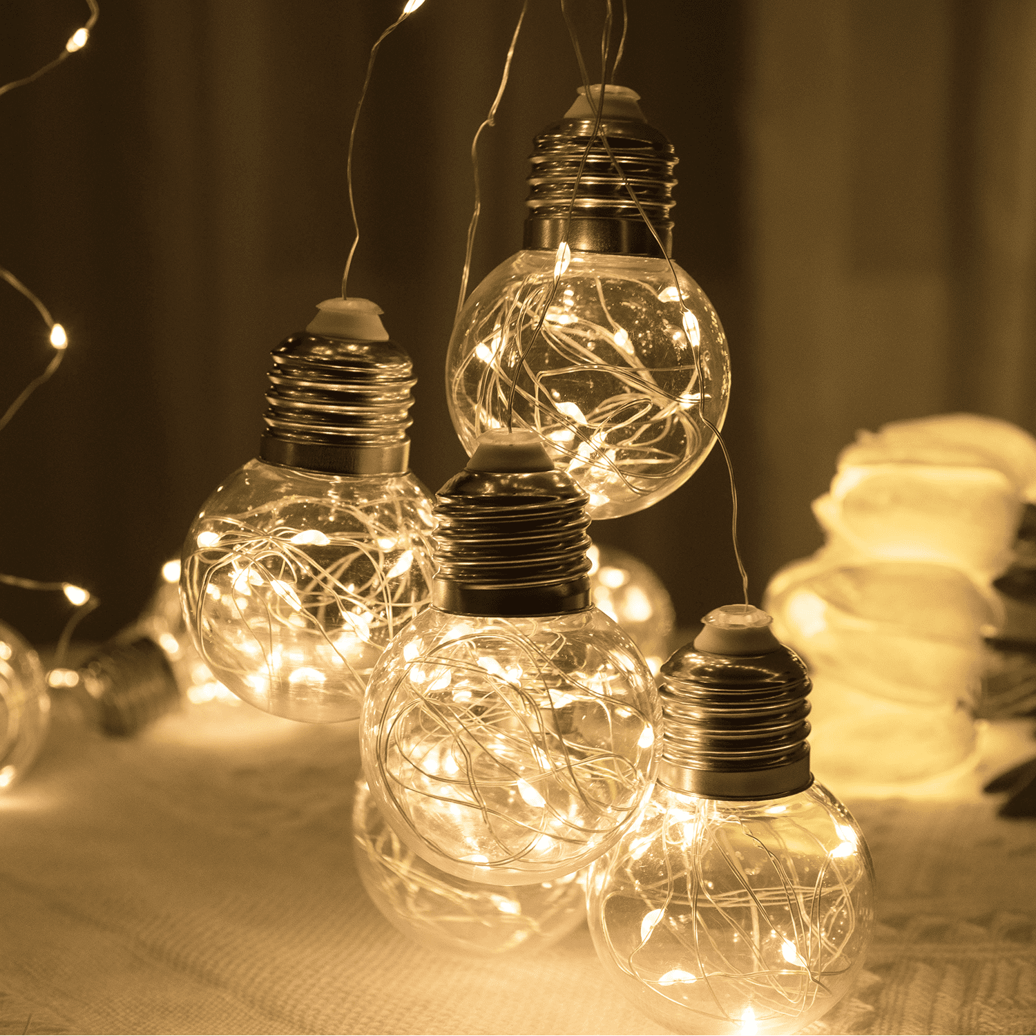 - The edison look bulbs are filled with fairy-like copper wire LEDs, hanging on silver wire curtain lights, to create a soft mode for just any place, add charm and character to your activities and provide relaxing mood lighting for party & holiday.